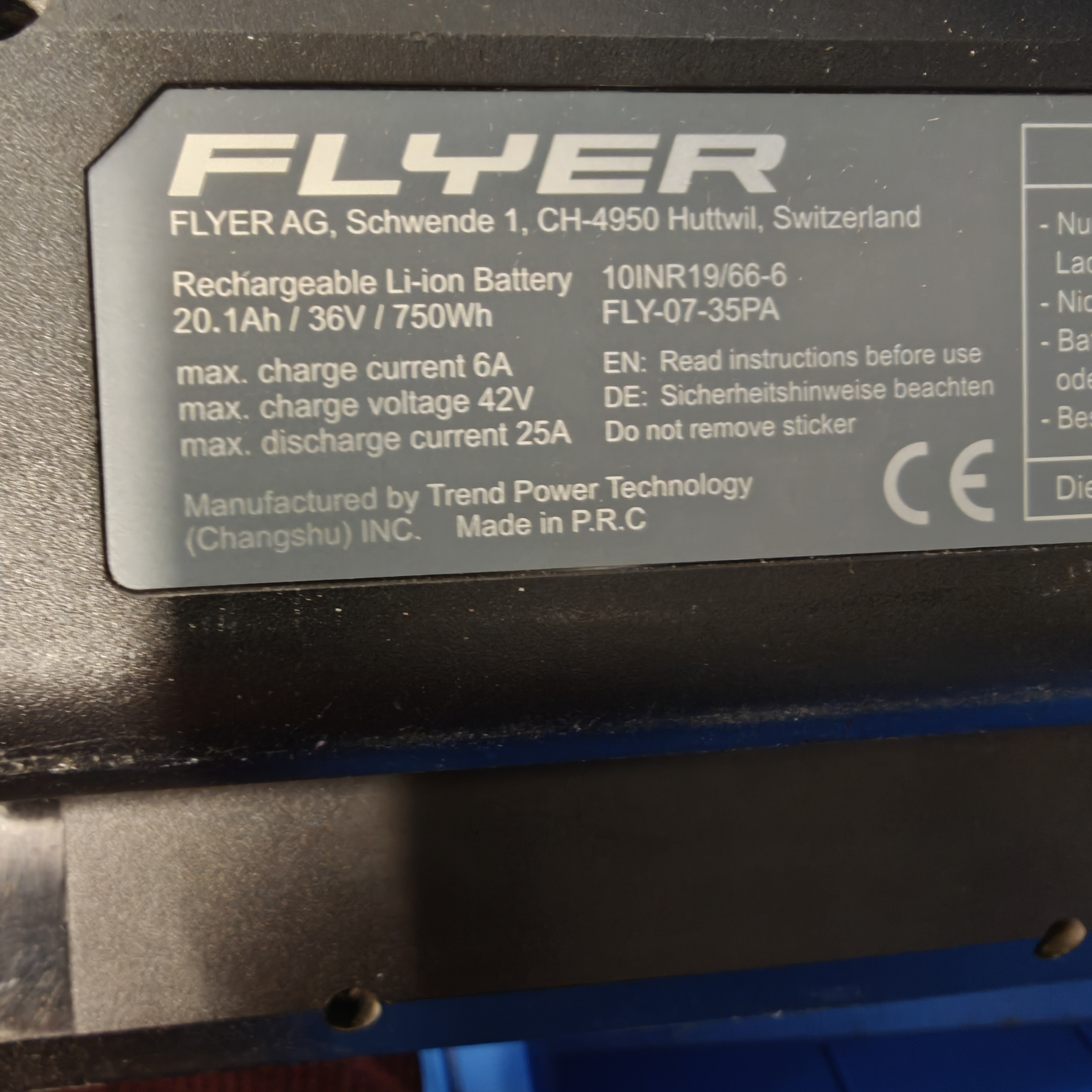 Wat je nog meer ziet is 750Wh wat aangeeft dat dit een behoorlijke capaciteit is. Zoek op Flyer en kijk of je de juiste 36V batterij gevonden krijgt, kijk of er een lamp op zit, hoe de laadaansluiting eruit ziet en de vorm van de accu.